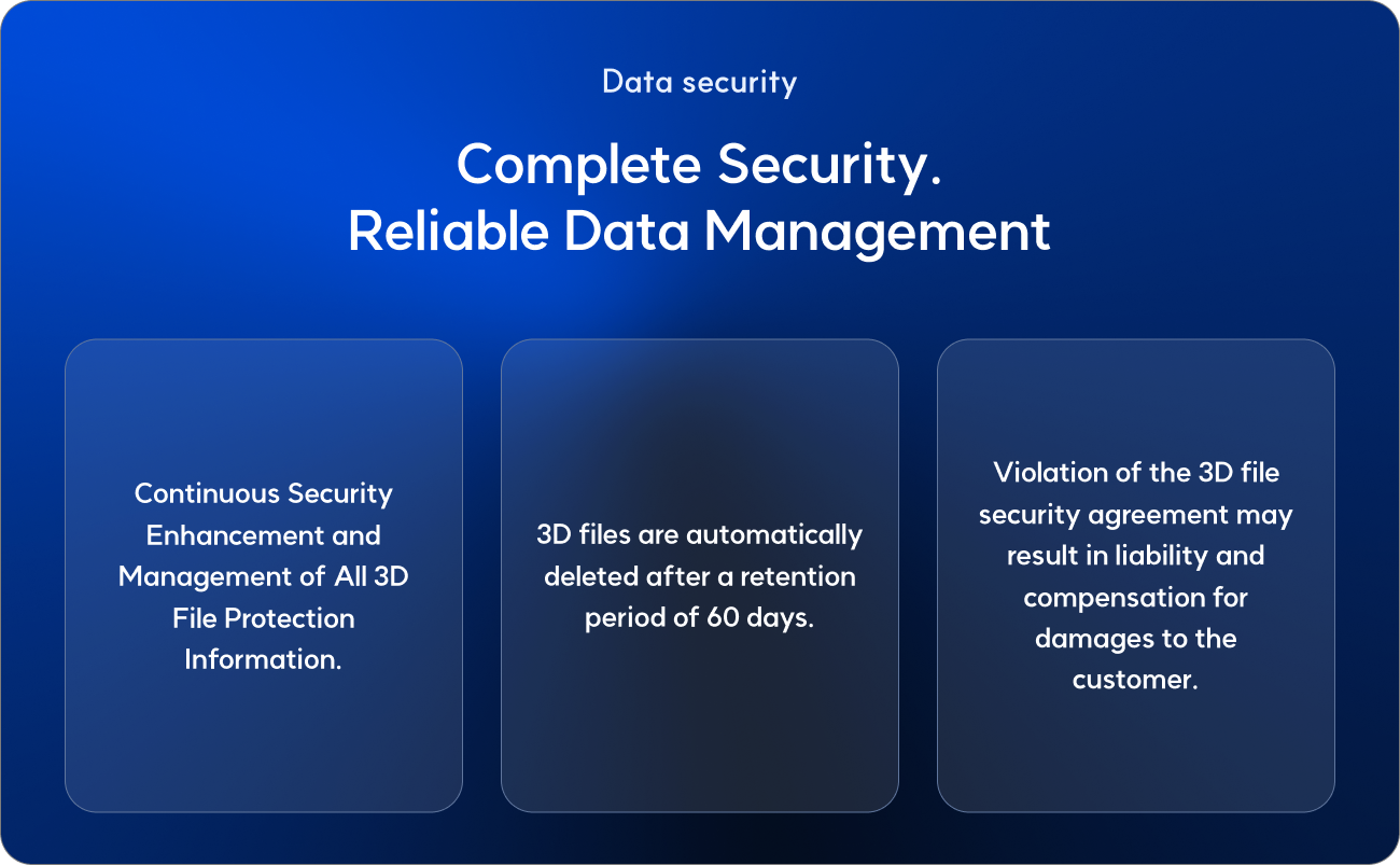 GLUCK has built the largest 3D printing smart factory in Korea, and we promise to safely protect and systematically manage our customers' valuable technical data so that it is not leaked to the outside.
